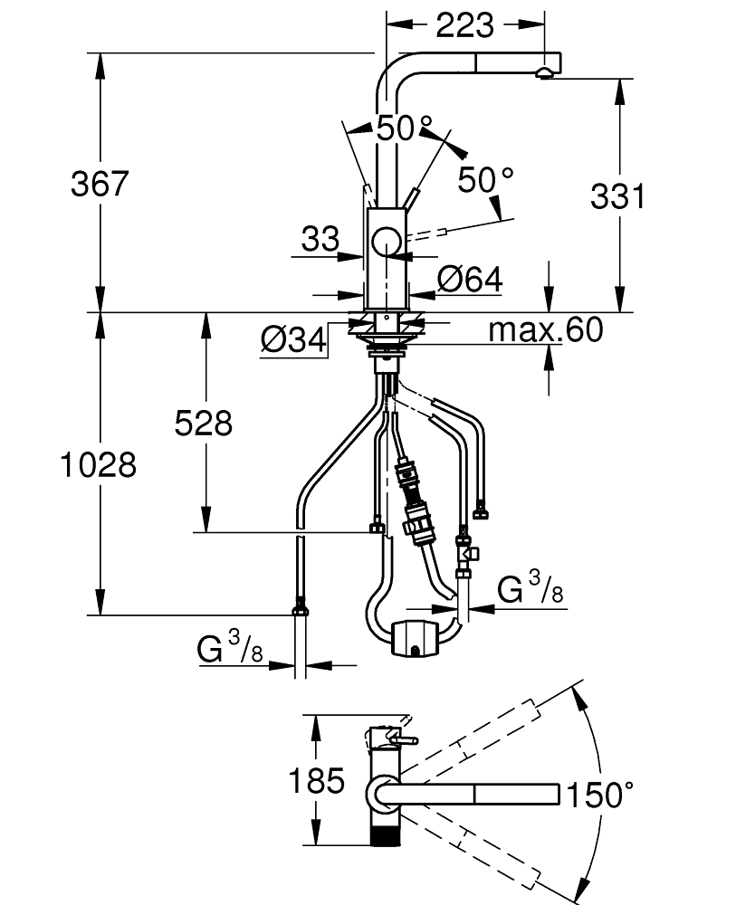 Високий L-подібний вилив із можливістю повороту на 150° дуже практичний – ідеально підходить для наповнення і миття великих каструль або графинів. Міцне фінішне покриття Grohe Long-Life Shine чорного кольору легко очищається і зберігає безжоганний зовнішній вигляд протягом багатьох років використання.